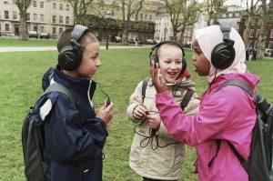 Three primary age children stand in the grassy Square, wearing large earphones and excitedly exchanging their experiences of 1831 Riot!