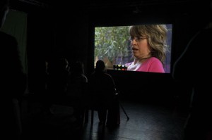 An audience sits in front of the second screen, watching Sophie projected in close-up, shown in a domestic setting, greenery visible in the window behind her.